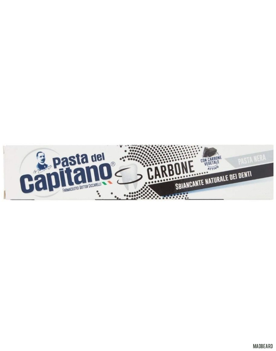 Pasta del Capitano Carbone - зубная паста, древесный уголь. Формула содержит активный растительный уголь, который при контакте с поверхностью зубов использует свою поглощающую способность, «связывая» с собой экзогенные вещества.