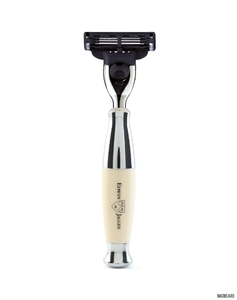 Бритвенный станок Diffusion английского бренда Edwin Jagger с системой Mach3 c ручкой из акриловой смолы цвета слоновой кости. Все металлические элементы бритвы сделаны из высококачественной нержавеющей стали и покрыты никелем для придания особого блеска и дополнительной стойкости к коррозии. Бритва поставляется в фирменной подарочной упаковке.