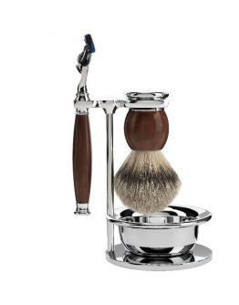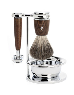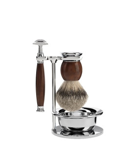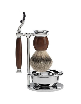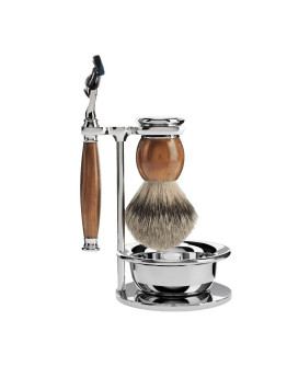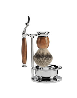 КупитьНабор для бритья из четырех предметов: - Безопасная бритва со сменным лезвием. - Помазок для брить..