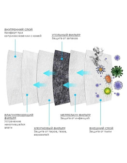 Маска 3-х слойная используется как средство индивидуальной защиты органов дыхания от инфекции. Изготовлены из двух наружных слоев нетканого материала различной плотности, средний слой фильтрующий элемент (мельтблаун) что обеспечивает защиту дыхательных путей до 98%, имеют гибкий встроенный носовой фиксатор, фиксируются за счет мягких эластичных круглых резинок, которые крепятся за ушами и не создают дискомфорта.