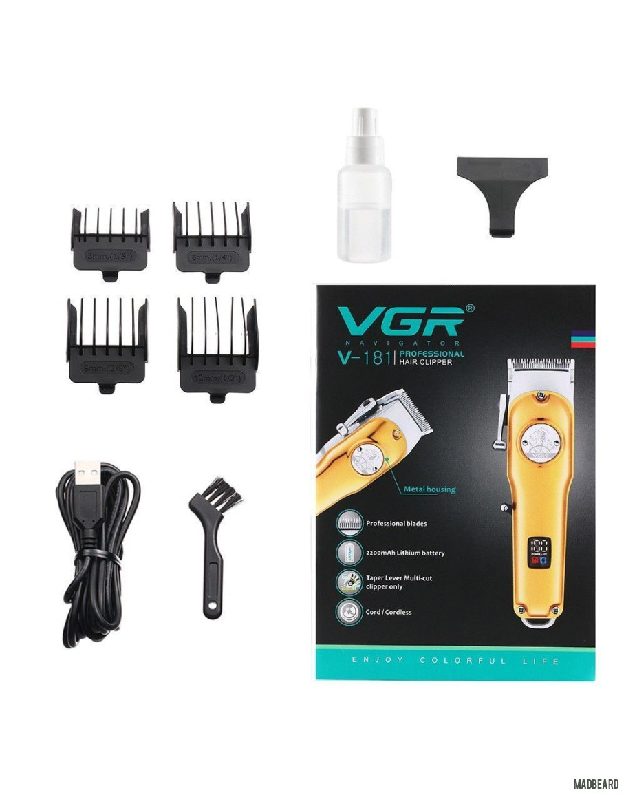 Беспроводная машинка для стрижки волос VGR V-181 в ретро-дизайне. Она предназначена для домашних условий, а также, для профессионального использования в парикмахерских, салонах красоты, барбершопах. Модель отличается ударопрочным цельнометаллическим корпусом, устойчивым к воздействию вибрации, низким уровнем шума, плавным ходом острых лезвий, удобством и длительным сроком эксплуатации. Универсальная модель имеет стильный винтажный дизайн, информационный дисплей заряда, отличную эргономику, сбалансированный вес и высокую мощность. Машинка оснащена классическим рычагом с прямым и обратным ходом для изменения длины стрижки от 1 от 3 мм. Плавное изменение длины среза применяют для стрижки фейдов — плавных однородных переходов на волосах.