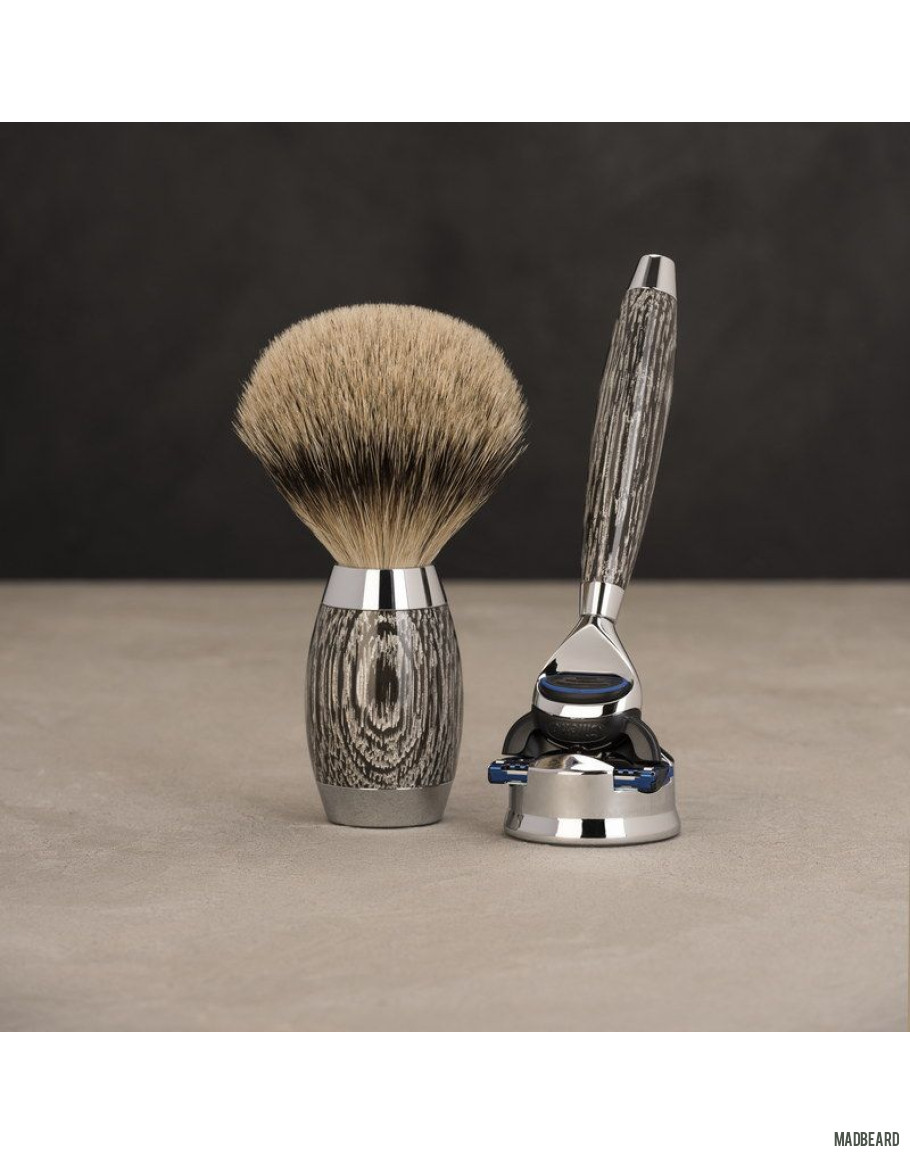 Совершенно новый набор, созданный в 2015 году в честь 70-тилетнего юбилея компании MUEHLE. Мореный дуб был выбран для его изготовления не случайно: этот материал столетиями покоился в недрах топей болот, вопреки всему накапливая нерушимую благородную прочность и надежность. Испещренная прожилками поверхность дерева глубокого бурого оттенка дополнена вкраплениями стерлингового серебра, что делает набор поистине блистательным. В завершение ручка бритвы и помазка запечатана несколькими слоями лака для водонепроницаемости.