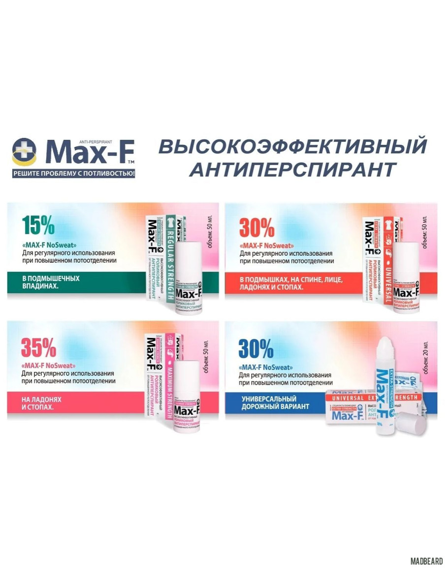 • не нужно вместе с MAX-F 30% использовать другие антиперспиранты, при необходимости заменить их специальными дезодорантами и парфюмами.