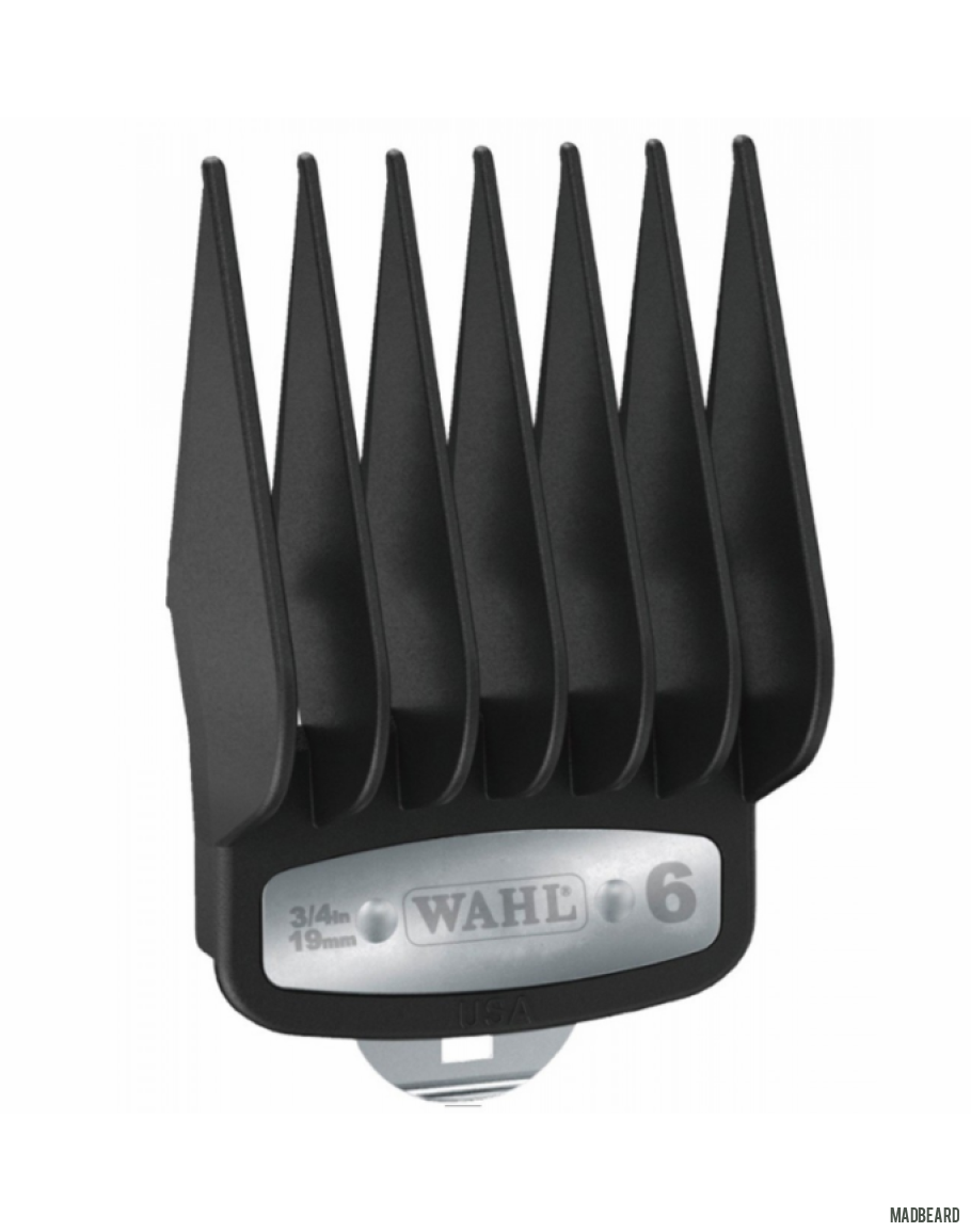 Wahl Premium WAHL19MM - насадка оснащена металлическим замком. Благодаря специальной геометрии зубцов насадки не царапают кожу клиента. Специальный состав пластика с добавлением стекла и металла делает насадки более прочными и продлевает срок их службы
